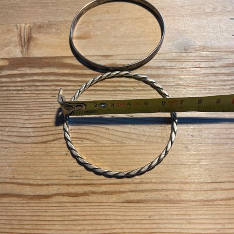 To armringe med mønster. Bredde 2-3mm. Diameter 7cm. Sølvfarvede men jeg tror ikke det er sølv. Kan være plet sølv. Vejer 10g.