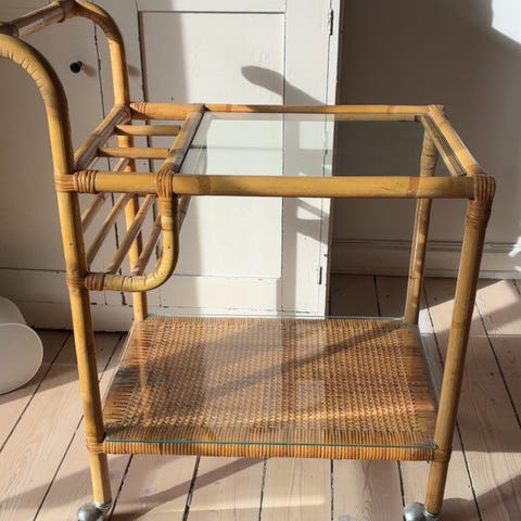 TROLLEY rullebord i messing med 2 glasbordplader, 70x50 cm. Dekorativt rullebord med et nærmest svævende udseende. Et elegant og meget populært bord med 2 glasbordplader med en messingforgyldt ramme omkring og med et fuldendt look helt ned til de fine hjul. Et chickt, fornemt og meget stilfuldt rullebord, der er anvendeligt som barbord, sidebord eller ekstra afsætningsbord i f.eks. køkken eller stue.