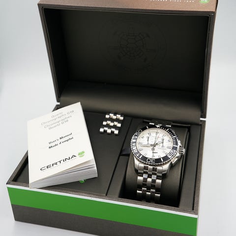 • Officielt Certina-certifikat med referencenummer, serienummer og købsinfo.