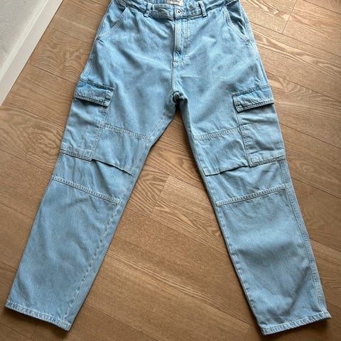 Brugt men meget pæne - har en lille plet på det ene ben (se billede), men er ikke forsøgt fjernet - lidt slid nederst ved buksebenene