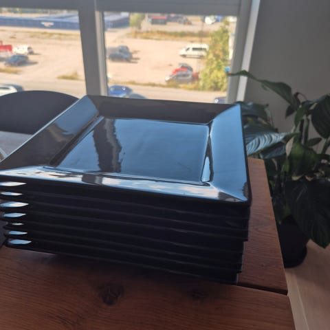 Plastik, Tallerkener, 8 store kraftige plastik tallerkner i sort plastik. De kan anvendes mange gange.