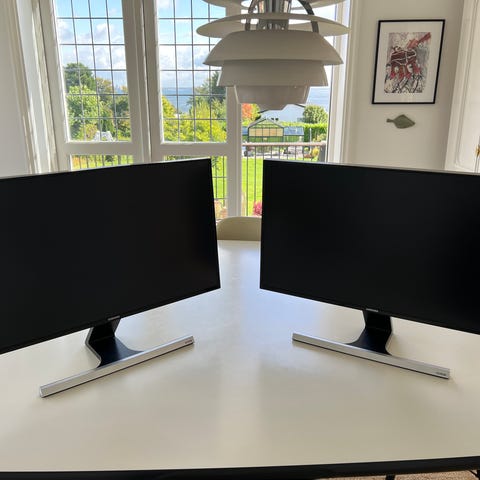 Der medfølger ledninger og standere så de kan stå på et bord.