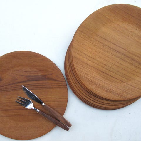 Dækketallerkner i teak, Vintage teak tallerkner, Teak tallerkner i pæn stand med alm brugsspor