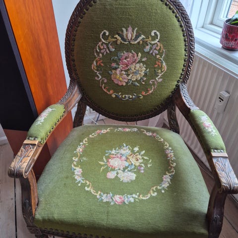 Mange år på bagen, men har været ompolstret og istandsat for omkring 15 år siden og er super komfortabel. Den har et par små pletter og nogle skrammer fra at blive flyttet rundt, men er ellers i god stand.