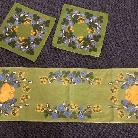 Forskellige flaconer, løbere og mellemlægsservietter. Noget er påske.