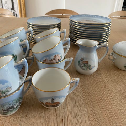 6 sæt Danmarksstellet i gaveæsker - aldrig brugt. Porcelæn. Hvert sæt består af kop og desserttallerken med guldkant og motiv. Har følgende sæt: H.C Andersens hus + Fredensborg - Dybbøl Mølle + Øster Lars Kirke - Byporten i Faaborg + Frederiksborg Slot - Sorø Akademi + Kalundborg Kirke - Stendyssen i Frejlev Skov + Himmelbjerget - Rosenborg + Amalienborg. 100 kr pr stk. - samlet 500 kr.