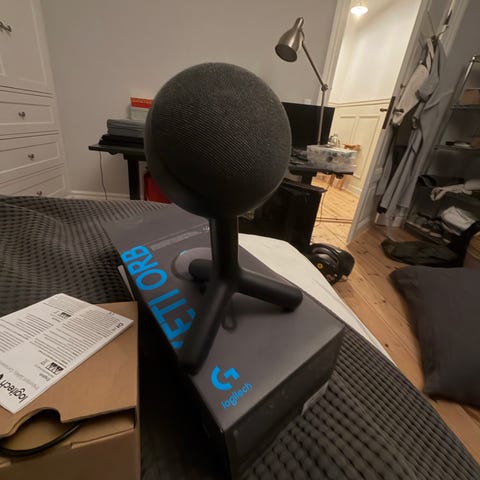 Logitech Blue Yeticaster. Super fed mikrofon der giver virkelig god lyd. Virker perfekt. Der er et par klistermærker på.
