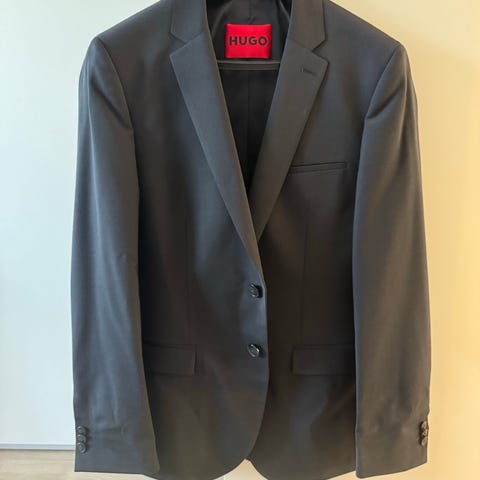 Sælges: Hugo Boss mørkeblåt jakkesæt, brugt én gang til konfirmation. Størrelse M. Se mål på billederne for præcise størrelser. Kan sælges separat, både bukser og jakke er tilgængelige.