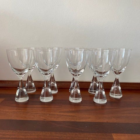 7 skåle med diameter 11,5 centimeter og 10 likørglas med diameter 4 cm. Taasinge fra Holmegaard.