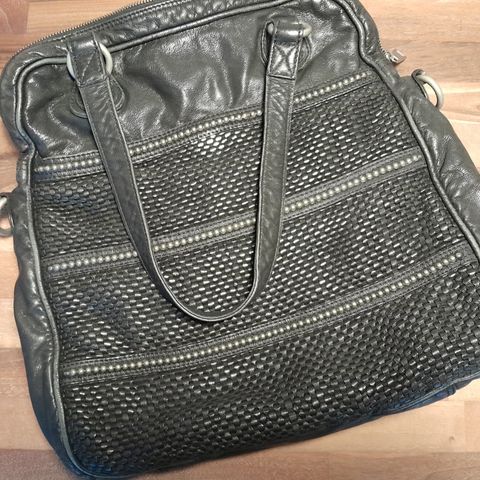Depeche læder taske. Rigtig god kraftig sort læder. Dybde 12 cm højde 25 cm og brede 31 cm, en god rummelig taske med en indvendig lille lynlås lomme. Skulder stroppen kan tages af, stort set som ny, brugt få gange.