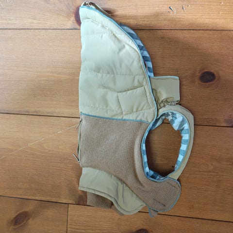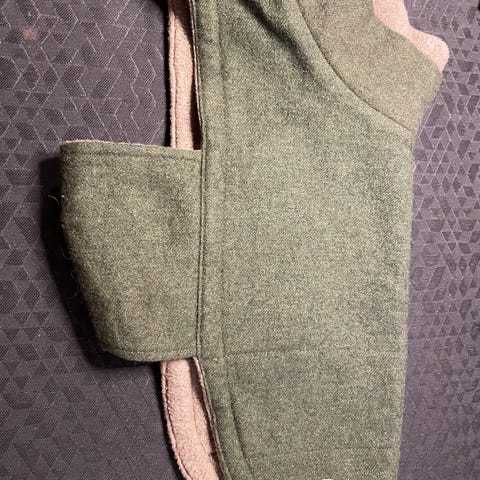 Vores hvalpe er blevet for store til deres vinterjakker 🤗 Vi har to af disse khakifarvede, vand- og vindtætte, vinterjakker. Inden i er der et for som man let kan tage af, hvis man bare vil nøjes med den yderste del. Remmen man binder rundt om hunden har en bred refleks, så hunden er let at se i mørke! De er kun brugt en sæson.