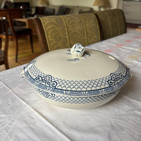 Sjældent engelsk lågfad fra Canterbury beregnet til smør. (Cantebury covered butter dish)