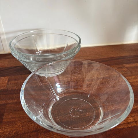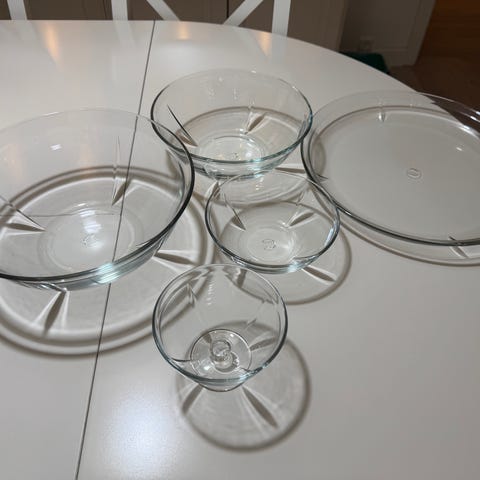 Super fint sæt med to karafler, en stor samt fire mindre skåle.
