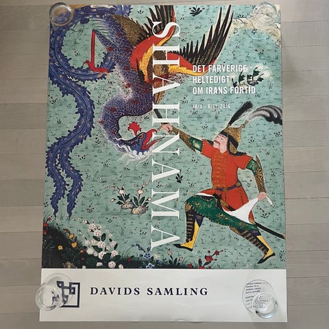 “Evening of Ashura” af Mahmud Farshchian. Plakaten fra 1990 er monteret under lak på en smukt udskåret træplade. 50x67 cm, pladen 60x80 cm. Plakaten er en reproduktion af the iranske kunstner Mahmud Farshchians maleri fra 1977. Plakaten viser kvinderne fra Imam Husayns familie sørgende over hans død ved slaget ved Karbala i år 680.