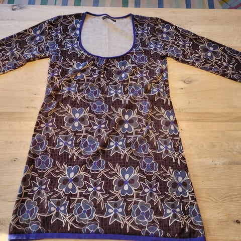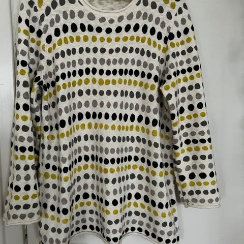 Super flot strik bluse med sort/ sand farvet mønster med mørk røde kontrastfarvede ærme- og hals kanter.