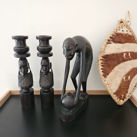 Højderne er hver især omkring 60 og 90 cm. Massiv mørklakeret træ. Ibenholt? Jeg ved det ikke. Den ene figur forstiller en kvinde og en anden er en slags akrobatik med 2 personer. Formentlig souveniers. Oplagt for trædrejere