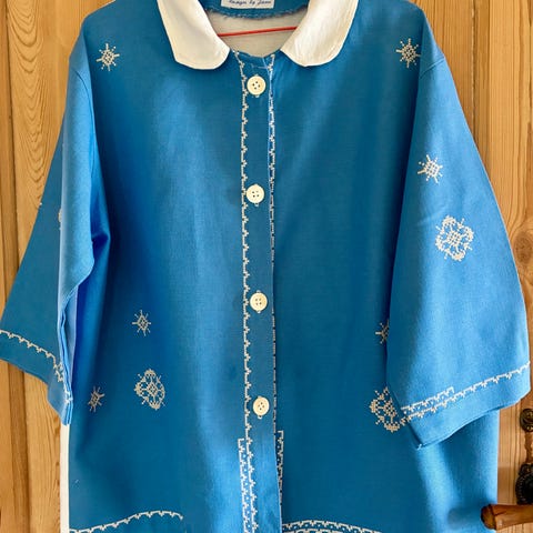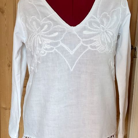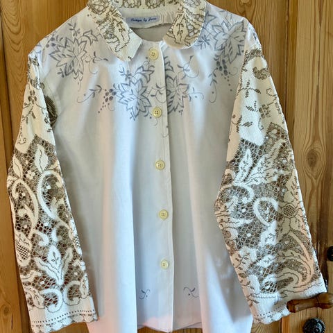 Smuk bluse med broderier og blonder i bomuld, syet af broderede duge i str M-L i eget design, Design by Jane, sælges kr 750,-. Fragten aftales individuelt!