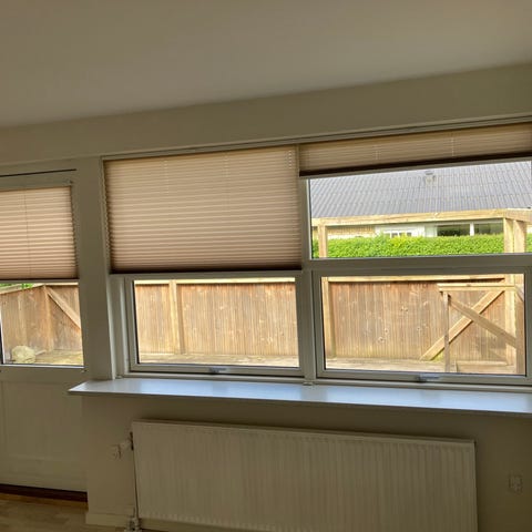 3 stk up&Down plissegardiner med greb fra merrisun sælges. De har været i brug i 4 år (dødsbo). De er lyse , lidt falmet - 2 forskellige størrelser 2 stk måler 202×81, 1 stk måler 202×111. De skal klikkes på, 18 beslag plus skruer medfølger.