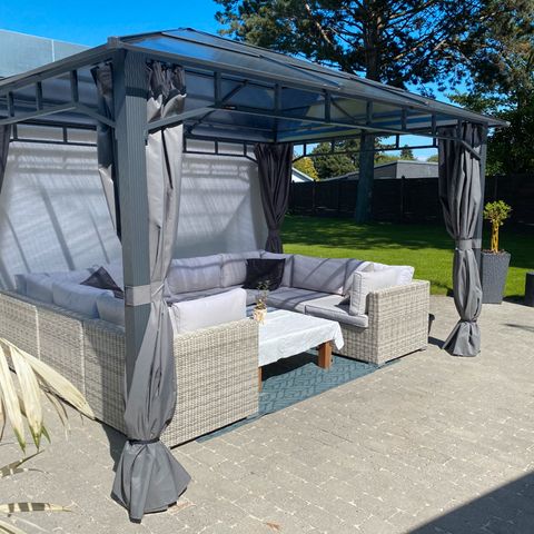 Have/Terrase Møbel i plast flet som kan tåle at stå ude, den har altid stået inde i en udestue