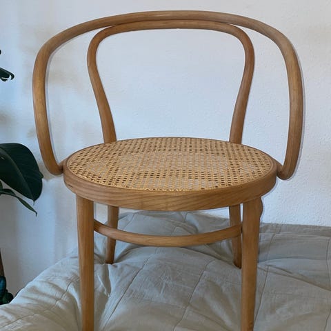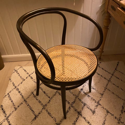 THONET, 210R, Stol, Thonet 210 R er en elegant og klassisk ”bentwood”-stol og betegnes af mange som et mesterværk i sin konstruktion og produktion: den fremspringende ramme udgør både ryglæn og armlæn og er bøjet i sin form af et enkelt stykke massivt bøgetræ. Bejdset i mørkbrun. Har enkelte brugsspor men står pænt i både farve og flet. Sælger 4 stk. samlet, samt 2 stk hvor der er gået hul i flettet. Koster 1500 at få skiftet hos fletmager, som kan modregnes i prisen. Pris er pr. Stol