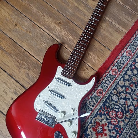Sælger min flotte originale Squier strat fra 83. En utrolig velspilende start der er lavet på samme opskrift som en 57 Fender US Strat. Nogen siger at det er det tætteste man kommer på en 50’er start uden at være det, ved ikke om jeg selv vil sige det, men det er i hvert fald en guitar, som er velbygget, lyder pisse godt og er super smuk.