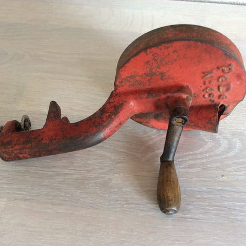 Snittebønneapparat, Eva, Redskab til at snitte bønner med. Ca 100 år gammel. Virker stadig fint.