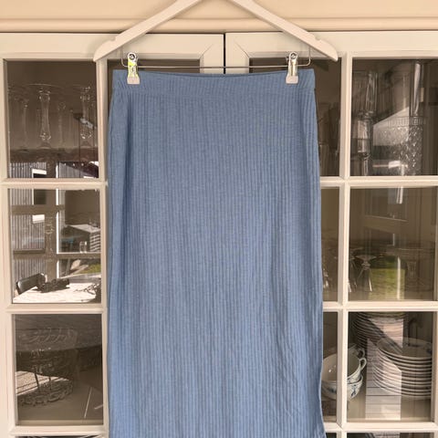 Fin nederdel med flæser og elastik I taljen. Livvidde Ca 2x40+ hofte 2x50 længde 68. Af polyester.