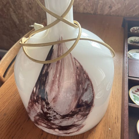 Sælger disse to elegante og sjældne bordlamper fra Holmegaard. De kan fx stå i på natbordet eller i stuen. De er håndlavede i opalhvidt glas med flotte swirl-detaljer i rosa, rød, brun og grøn. Hver lampe er unik, og farvemønstret varierer en smule.