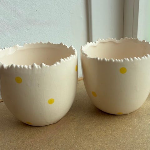 3 ældre gule påskeæg skåle krukker, 3 gl gule skåle Æggeskal Påskepynt