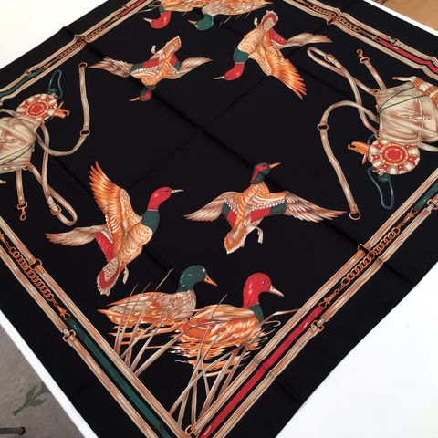 Ubrugt Stort Grønt tørklæde med ænder og jagttaske str. 87x87cm. 3 for 2.
