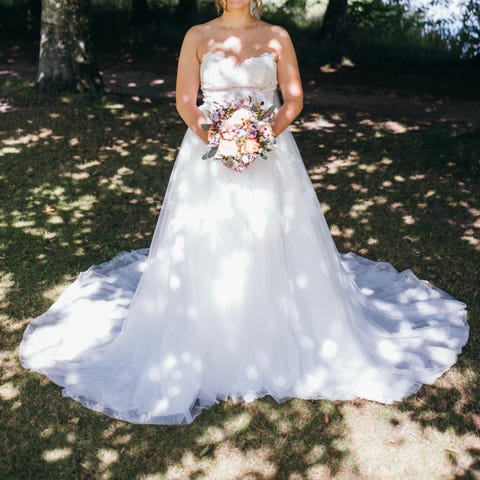 Brudekjolen brugt 1 x er lidt snavset i slæbet sko fejler intet lidt slid mærker under skoen efter en dags brug.