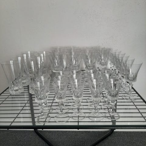 1 CHAMPAGNEFLØJTE 19,2 cm - pr stk kr 175, 6 RØDVIN - STORE 19.4 cm - pr stk kr 145, 9 hvidvinsglas pr stk kr 95, 6 cognacglas pr stk kr 85, 5 snapsglas pr stk kr 44.