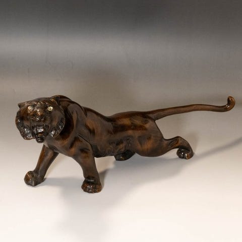 Antik sølvbelagt Tjur skulptur, monteret på smukt udskåret kinesisk træbase. Start 1900 tallet.Mål ca. : 17,5x17x17 cm. Stand: se billeder.