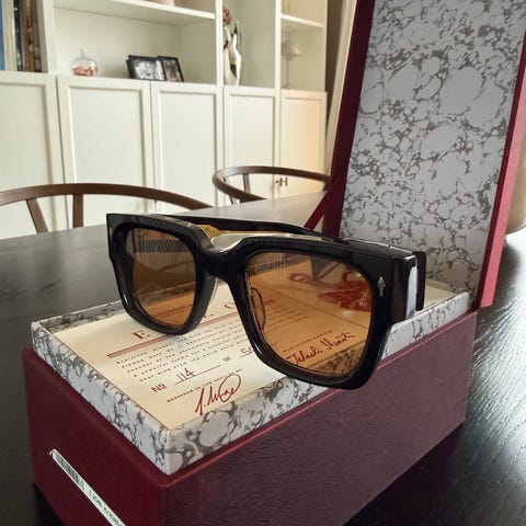 These limited-edition aviator-style sunglasses were made in collaboration with George Cortina. Jacques Marie Mage sources its premium cellulose acetate from Takiron, a Japanese factory that's been around for nearly a century. These sunglasses have strong yet flexible frames, gradient lenses, and adjustable nose pads.