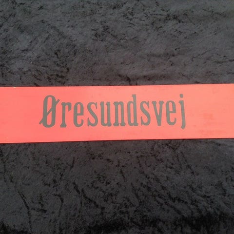 Skiltet er lavet af træ, og måler 60,5 x 12 cm