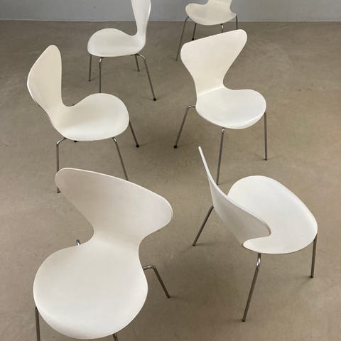 Arne Jacobsen, stol, 3107, 4 stk nypolstret 7’er stole. Alle faste i ryggen og stel uden rust. Polstret i sort semi anilin og ikke taget i brug. Pris pr stk 2650kr
