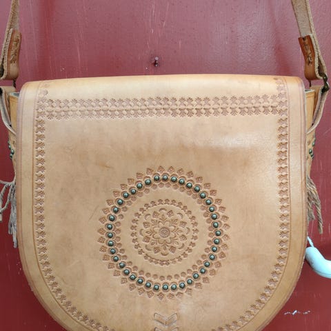 Kraftig kerne lædertaske med skulderrem, den har et rum og en lomme indvendig.