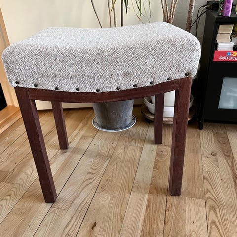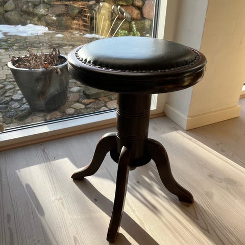 Gammel klaverskammel indstillelig i højde fra 46 til 54 cm. Solidt, gammelt håndværk med nyere betræk.