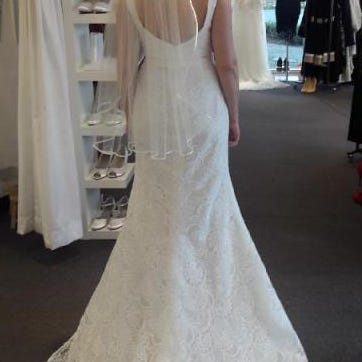 Brudekjole, White One, str. 36, God men brugt, Smuk off white brudekjole fra White One Barcelona med vintage inspireret blonde, gråt bånd i taljen og indsyet stropløs bh. Både bånd og bh kan pilles af. Materialet er strækbart, så den er yderst behagelig at have på. Jeg har brugt den til flade sko, så den passer pt. en str. 36/S, som måler 173 cm, men den kan selvfølgelig lægges op og syes ind/ud hvis nødvendigt. Ekstra bånd til brudebuket samt let slør på hårspænde medfølger.