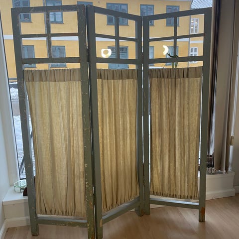 En afskærmning der består af 2 fag. 84 cm bred og 154 cm høj pr. fag. I alt 191 cm høj og 2 x 84 cm bred. Stativ er jern og beklædning er plexiglas. På hjul. Ældre med patina. Gammel og antik.