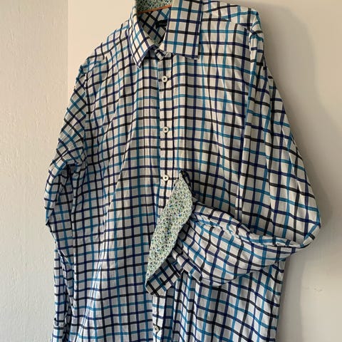 1. stk. sommerskjorte med korte ærmer med motiv, mærke Revolution, organisk bomuld, str. M. Pris: 100,-kr.