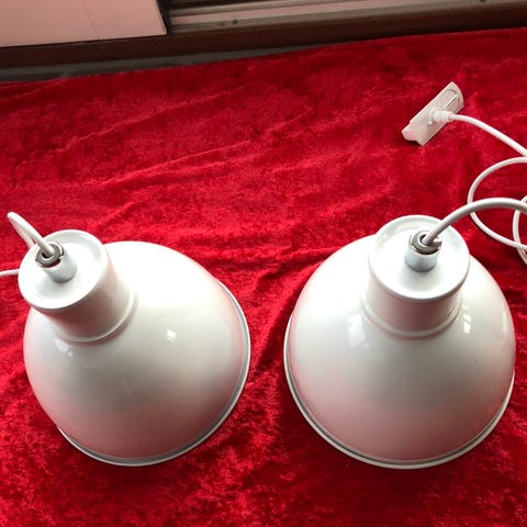 To hvide aflange lamper til ophængning i lofter. Pæn stand.