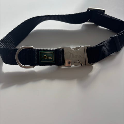 Hunter, halsbånd, helt nyt med prismærke, str. medium. Kan passe Cairn Terrier. Pris 85. Kan afhentes i Roskilde eller Nykøbing Sj. eller sendes på købers regning.