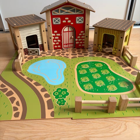 Bondegård til de helt små med dyr, hestevogn, senge og stole.