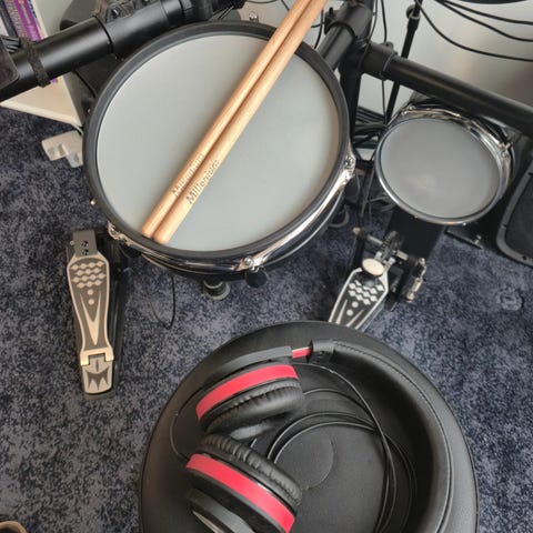 Super trommesæt til den unge begynder trommeslager, men hvor øvede voksne også kan få et diskret, men spilbart sæt, som kan bruges til alt fra øvning, indspilning og live sessions. Jeg har efter jeg har købt det, arvet et andet trommesæt, og selvom jeg gerne ville, har jeg ikke plads til 2 sæt. Derfor må dette videre til næste. Det kommer i original kasse, med kvittering og garanti. Kan sendes på købers regning. Prisen er sat helt fair, da det kun er spillet på to gange, så skambud ignoreres.