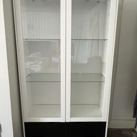 Gl reol, Et flot reol med glas i midten og 3 skuffer i bunden til 500 kr 26842663 mål L 142 cm H 140 b 40