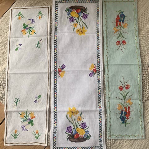 Påskeløber, håndbroderet, ca. mål: 84 x 25 cm. Ubrugt, den har kun været i skuffen, ingen pletter/skader, den er som ny. Fra et røg- og dyrefrit hjem.