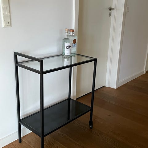 Barbord l: 64 h: 75, Barbord i metalsort med guldspray på knopperne. Bordet måler 65 x 74 cm. Bakken kan tages af.