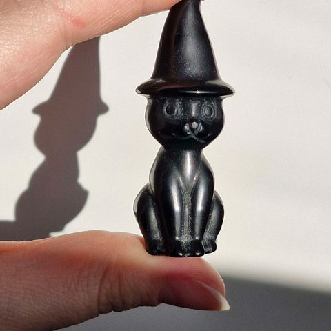 Figur af en kat i en heksehat, udskåret i en sten kaldet rød web jaspis, eller "netværks-sten". Ca. 5,5cm høj.