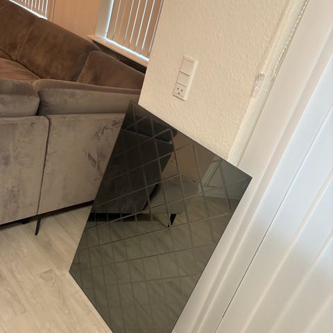 Der er slået en lille flig af nederste venstre side af spejlet. Det kan males så det ikke ses.